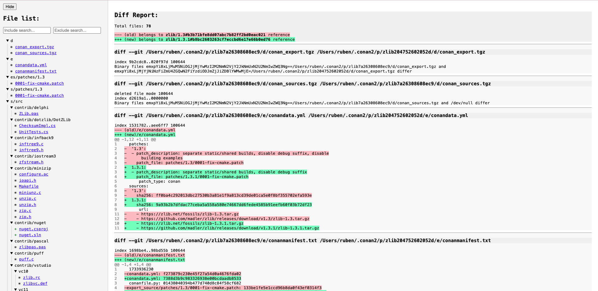 $ conan report diff --old-reference="zlib/1.3" --new-reference="zlib/1.3.1" --format=html > diff.html